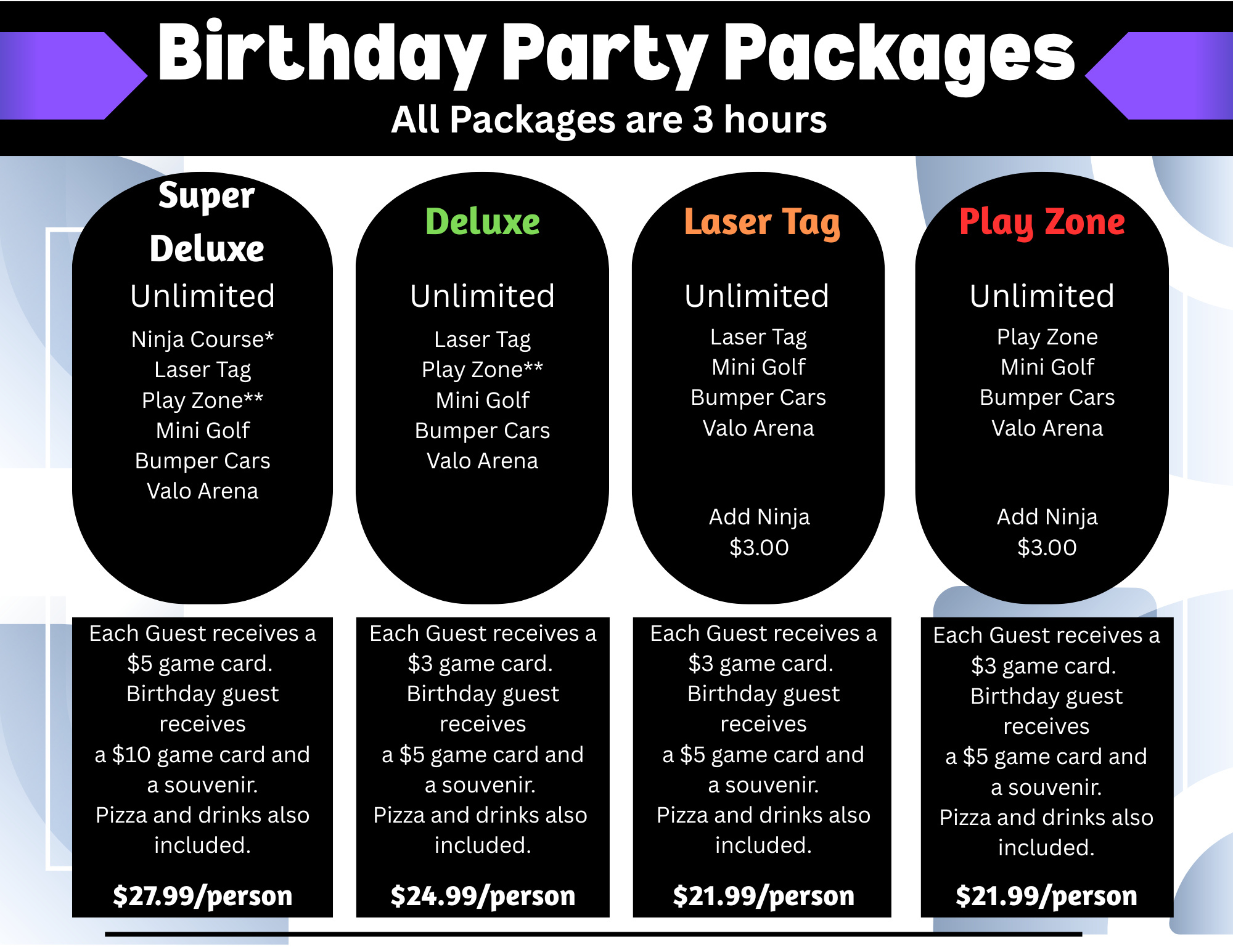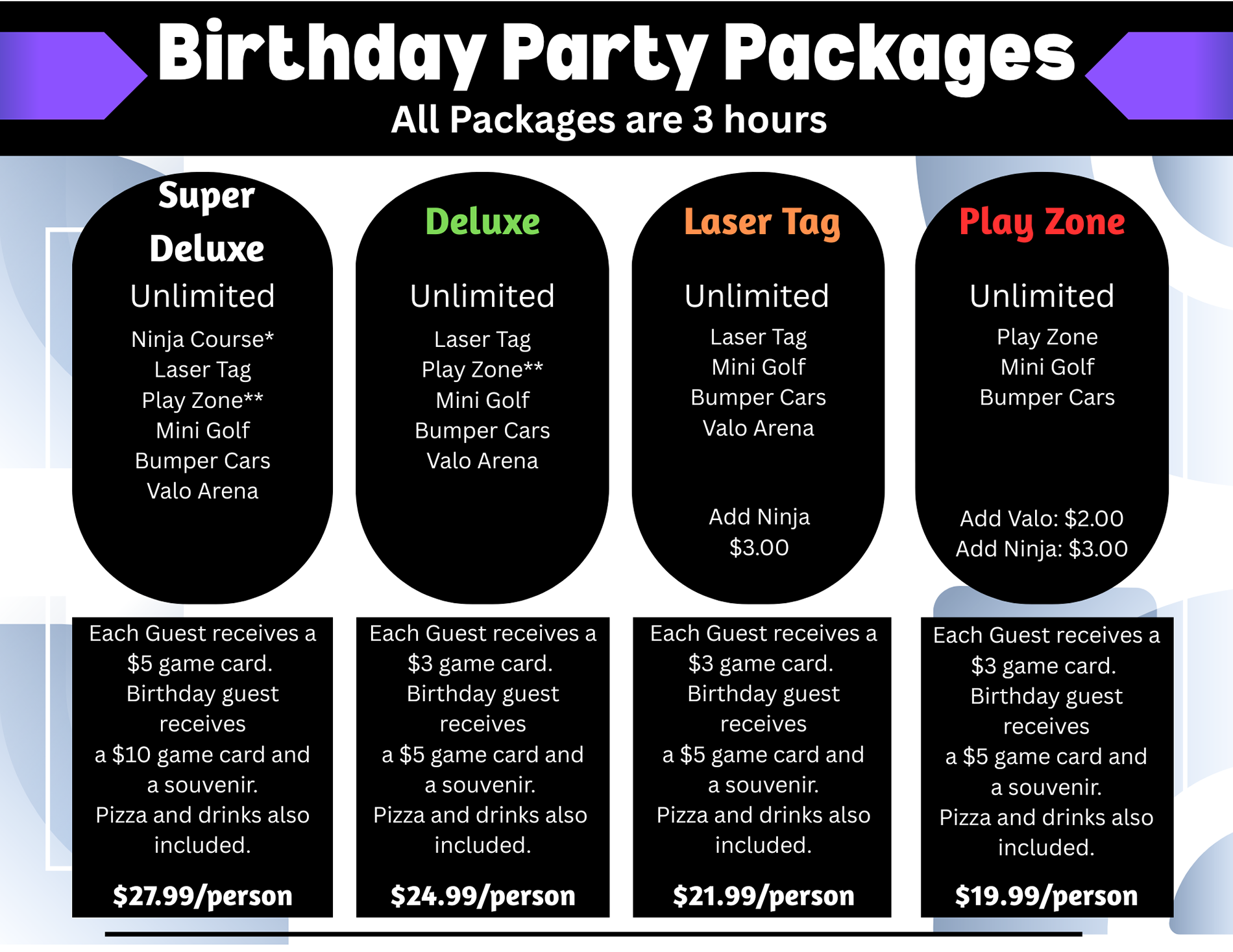 Seating at your table in the party area is only provided for guests that have purchased a birthday package only. Parent passes do not count for seating in our party areas. Seating in our general eating area is also available on a first-come, first-served basis.